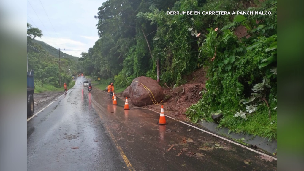 Además, estas precipitaciones causaron varios derrumbes, en el kilómetro 12 de la carretera que conduce a Panchimalco, rocas de gran magnitud cayeron sobre la vía, obstruyendo el paso en uno de los carriles, debido a la inestabilidad del terreno no es posible realizar la detonación, por lo que señalizado para advertir de la problemática a los conductores.
